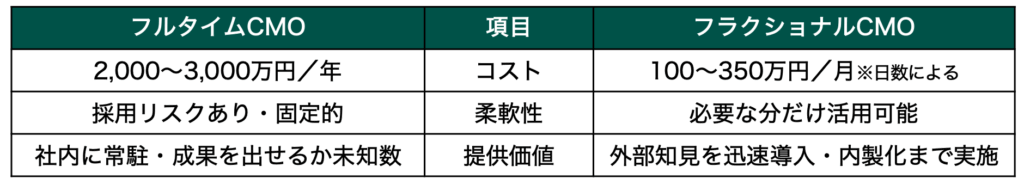 フルタイム幹部を採用するより固定費を抑えつつ、即戦力を投入。採用や立ち上げの待ち時間を短縮し、初月からKPI運用を開始できます。